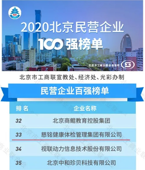 10月10日,由北京市工商聯(lián)與北京經(jīng)濟技術(shù)開發(fā)區(qū)管委會聯(lián)合舉辦的“2020北京民營企業(yè)百強發(fā)布會”在京順利召開,會上發(fā)布了2020北京民營企業(yè)百強調(diào)研分析數(shù)據(jù)、榜單并授牌。慈銘體檢憑借積極主動履行企業(yè)社會責任、熱心參與公益...